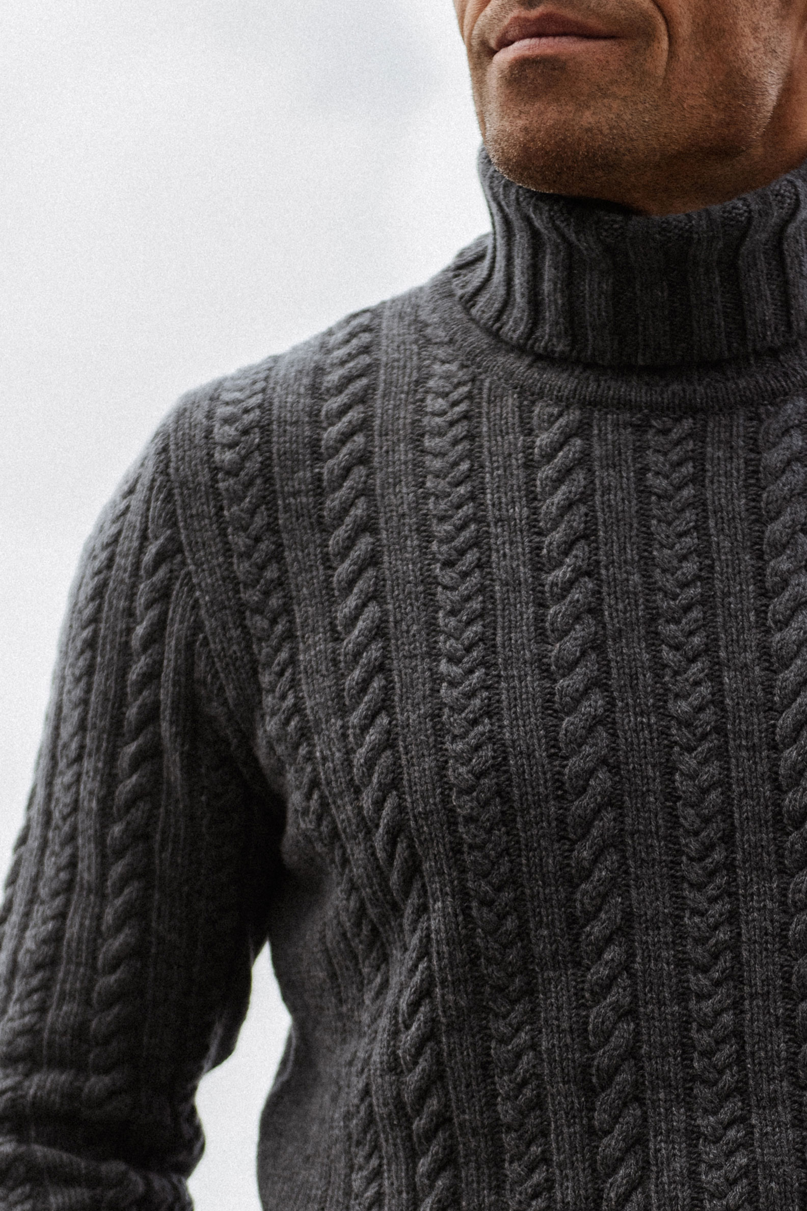 Voldemar mallilla on korkea kaulus. Se on paksu, hyvin lämmin ja pehmeä villapaita. Oikea talvineule. Neulepuserossa on kokonaan isot palmikot, muodostaen viivoja kuin paksut köydet. Voldemar on hyvin käytännöllinen perusneule ja After-Ski neule. Normaali mitoitus.