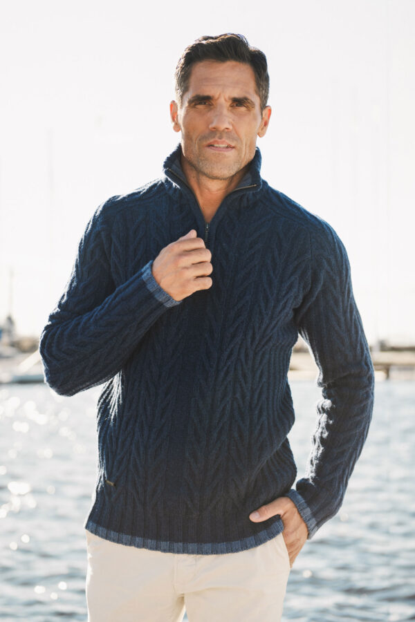 Dan Zip on miellyttävän keskipaksu, pehmeä ja lämmin neule, lyhyellä muovisella vetoketjulla. Ristikkäiset palmikot on kudottu vuorotellen koko puseron läpi. Hihan ja helman alareunassa on jeans värinen kudosraita, mikä on käytännöllinen ja ei näytä helpolla likaantumisen jälkiä. Kauluksen sisäpuoli on myös jeans värinen.