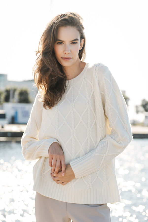 Keskipaksu, lämmin ja pehmeä merinovillapusero, jossa on pyöreä kaulus. Pusero on rento. Pusero on kudottu kokonaan pienellä palmikkoiden kuosilla.