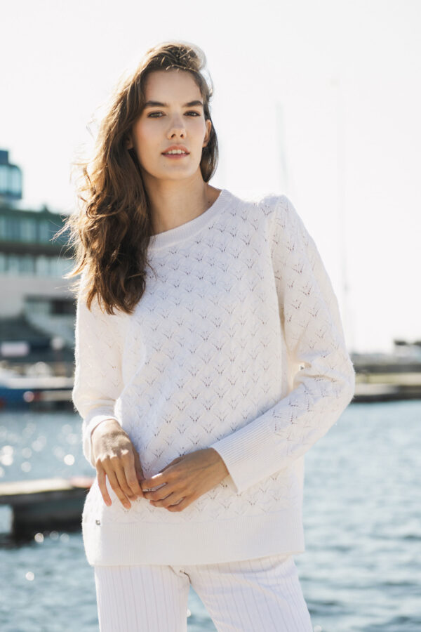 Ohuempi mutta lämmin ja pehmeä merinovillapusero, jossa on pyöreä kaulus. Pusero on rento ja ohut. Pusero on kudottu kokonaan pitsikuosilla.