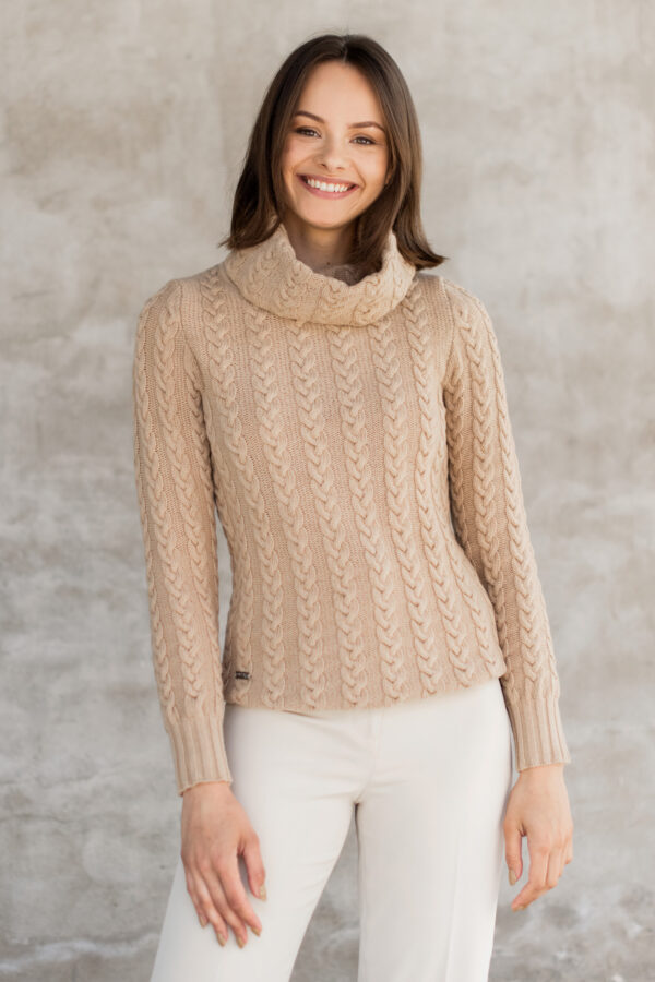 Avara kõrge kaelusega keskmise paksusega kerge, soe ja pehme lambavillane kampsun. Kampsun on üleni palmikute koemustriga.